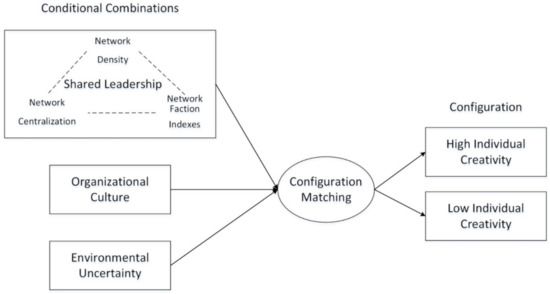 Innovative work usually confronts complicated management situations, and individual creativity would be interactively impacted by various factors. According to Venkatraman’s matching logic, different permutations and combinations of factors in a certain situation may have important impacts on the results [34]. Shared leadership can provide team members with more resources, impact team members interactively with the organizational culture, improve the collective vision of team members, and make team members more confident to take environmental uncertainties as development opportunities [35]. Based on social network theory, under the interaction of shared leadership and organizational environment, the special leadership network formed among team members can continuously improve the individual’s reputation and confidence, continuously improve the internal communication channels of the team, and increase the transfer of knowledge and information between team members, thereby sustainably improving individual creativity [36]. Based on the above theoretical analysis, this research insists that the individual creativity of team members would be impacted by the different matching results of shared leadership and external organizational culture, as well as environmental factors, forming a post-matching systematic phenomenon. When network factors of shared leadership match the organizational culture and environmental uncertainties, innovative teams can enhance the individual creativity of members effectively. Based on the logic matching and architectural theory, this research constructs a factor matching model for the improvement of individual creativity, as shown in Figure 1.