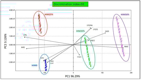 77]. Selected color codes and E-nose and E-tongue sensors identified differences between groups in relation to the percentage of HIM integration. The volatile component was mainly distinguished by LY2/G, LY2/AA, P301 and T401, which are sensors primarily sensitive to volatile organic compounds derived from proteins and lipids such as nitrogen-containing compounds, hydrocarbons and aldehydes [