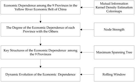 In this study, mutual information and kernel density estimation are used to calculate the economic interdependence of provinces in the Yellow River Economic Belt. In previous studies on the coordinated development and economic dependence of urban agglomerations, methods such as spatial econometric modelling, regional dependence structure, and network risk propagation were applied to describe the dependence of each node in urban agglomerations or urban development clusters [42,43,44,45]. Compared with the above methods, mutual information and kernel density estimation have the following advantages: First of all, the traditional econometric-model-based study of regional economic interdependence is mainly applied in the linear condition, but some studies have proved that the economic time series often show nonlinear characteristics, and mutual information can be used to calculate the interdependence of variables under both linear and nonlinear conditions [46,47,48,49,50]. In addition, the econometric models calculating the dependence relationship often need to set the parameters of the model in advance, and the setting of parameters will affect the final estimation results, while mutual information is model-free, therefore it is not necessary to set the model in advance. Finally, a large number of studies need to make assumptions about the distribution of samples. For example, in most cases, it is assumed that the samples obey normal distribution, but in reality, the samples tend to show peaked and thick-tailed distribution. Therefore, this paper uses the kernel density estimation method to calculate the mutual information between variables, which does not depend on specific assumptions of data distribution.