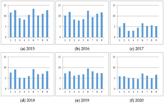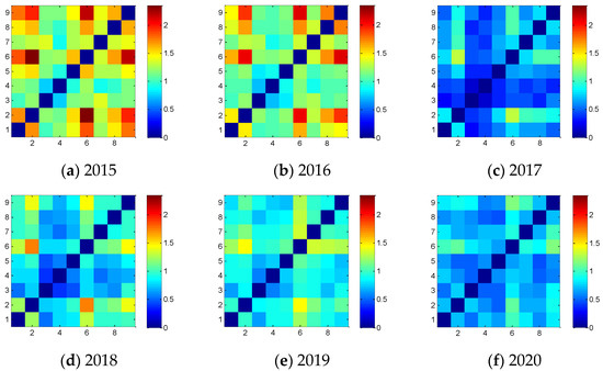 Figure 2 shows the mutual information values of the economic interdependence of the nine provinces in each of the past six years. In order to visually observe the changes in economic interdependence in different years, this study uses thermal maps to display the results, in which the abscissa and ordinate represent the numbers of the nine provinces as indexed in Table 1. In order to achieve a better contrast effect, the value ranges of these six thermal maps are all adjusted to 0–2.348, because the maximum mutual information value among provinces over the six years is 2.3472 between Henan (No. 2) and Shandong (No. 6) in 2015.