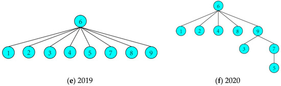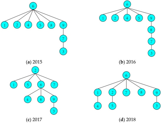 The MST is one of the spanning trees of a network with the maximum total edge weights. It can be used to help to disentangle the network and to visualize its key structures [54]. Figure 4 shows the MSTs in each of the six years, and the numbers represent the numbers of the nine provinces, as shown in Table 1. It can be seen that the structures of the trees are different.