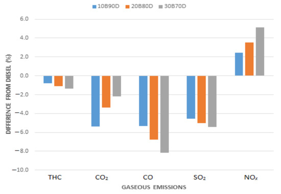 | [94] | Jatropha | B10, B20, B30, B50 | Full load, 1500 to 2400 rpm | 13.08 | − 16.3 | − 7.4 | 27.25 |