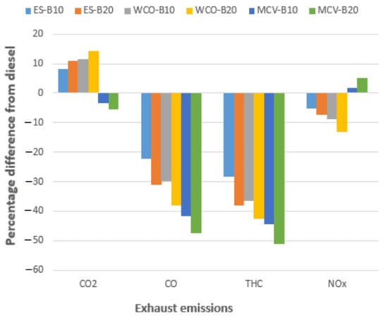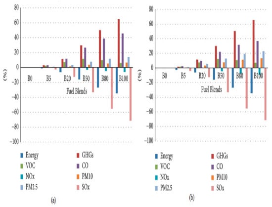 - Emission reduction facts from the National Biodiesel Board of the United States showed that the combustion of B100 as a transportation fuel decreased total HC, PAH, carbon, and sulfur emissions by 67%, 80%, 48%, and 100%, respectively. A hypothetical scenario forecast showed that the daily GHG emissions would be reduced by 712.1 CO2-equivalent tons in 2025, if half of metropolis passenger cars and HDDTs were to be run on B20.