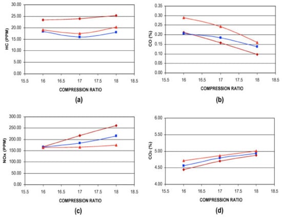 - Sayin, C.; Gumus, M. Impact of compression ratio and injection parameters on the performance and emissions of a DI diesel engine fueled with biodiesel-blended diesel fuel. Appl. Therm. Eng. 2011, 31, 3182–3188. [Google Scholar] [CrossRef]