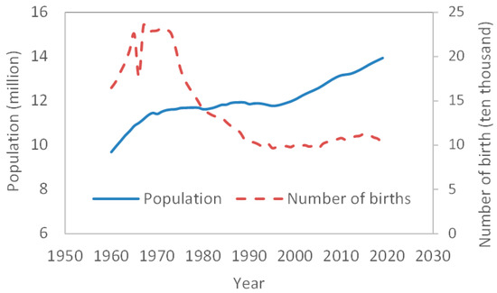A critical issue in Japan is that its population has been shrinking since 2007. In Japan, the total fertility rate—the average number of babies a woman gives birth to during her life—has fallen from 2.08 in 1974 to 1.36 in 2019 [26], while a total fertility rate of 2.07 is required to maintain its population levels [27]. Because Japan’s economy and social systems were structured on the premise of population growth, the depopulation will profoundly impact the workforce, making it difficult to maintain the current social security systems, such as pension benefits and medical insurance. Tokyo, however, is an exception among Japanese cities to the depopulation trend. As shown in Figure 2, Tokyo’s population was very stable during the 1980s and the 1990s and showed an increasing trend since 2000. Nevertheless, the number of births per year has dropped so largely since 2000 as compared to previous decades. Tokyo’s fertility rate declined from 2.73 in 1950 to 1.23 in 1990 and to its lowest 1.0 in 2005, which is worse than the national average [28]. Therefore, the population growth in Tokyo is maintained by the population influx from other regions.