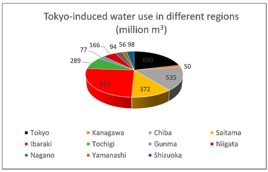 Using interregional input-output table and water consumption data, a study by Ishiro [31] revealed Tokyo’s dependence of water on other regions, as shown in Figure 3. As seen clearly from the figure, for the water use in Tokyo, local water resources provided 700 million m3 while Ibaraki and Chiba prefectures supplied 800 and 500 million m3, respectively. In total, other prefectures covered 80% of the water demand in Tokyo. Wording differently, the water self-sufficiency rate in Tokyo is 20%. Among regions contributing water resources to Tokyo, Niigata Prefecture is about 300 km away from Tokyo and is the farthest among them.