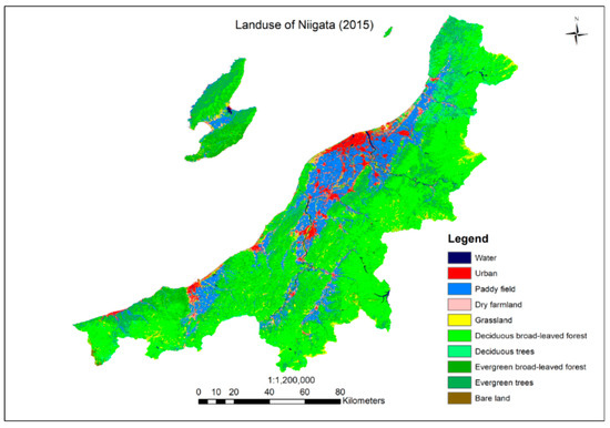 Niigata Prefecture stretches about 240 km along the Sea of Japan and consists of 12 cities. It is the fifth-largest prefecture of Japan in terms of land surface area. As revealed by the land use map (Figure 4), the primary industry in Niigata Prefecture is agriculture, with rice as its principal product. It has the highest rice output among rice-producing prefectures of Japan, covering 8.1% of Japan’s rice market. Niigata’s food self-sufficiency rate is 107% on calorie base and 108% based on production, respectively. In addition to water resources and food, Tokyo also uses energy produced in Niigata. The Kashiwazaki-Kariwa Nuclear Power Plant is in Niigata Prefecture, which started in 1993. It is the largest nuclear generating station in the world by net electrical power rating, owned and operated by Tokyo Electric Power Company (TEPCO) and supplies electricity to Tokyo.