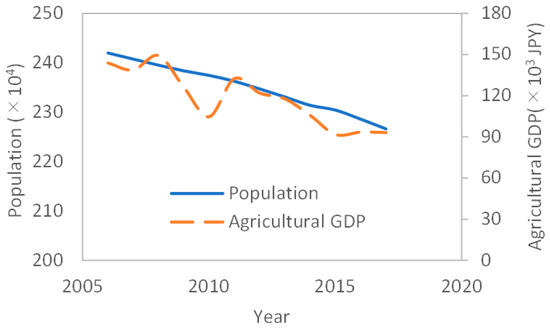 The population of Niigata and GDP of agricultural sector (Data source: [36,37]).