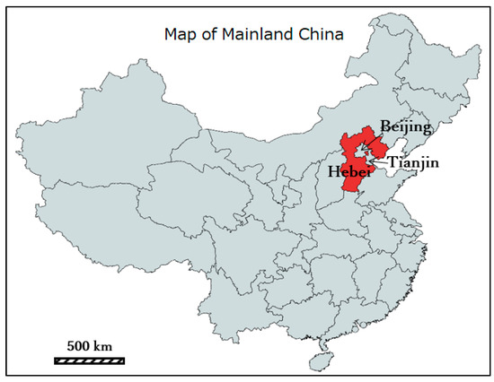 Figure 6 shows the locations of Beijing, Tianjin, and Hebei Province. Beijing, Tianjin, and Hebei Province is the largest urban agglomeration of China, covering 2.2% of all land resources, accounting for 8% of the country’s population, and generating 10% of the GDP in 2015 [38]. Ecological footprints of Beijing, Tianjin, and Hebei have been studied and found that the Hebei Province has both the highest value of ecological footprint and highest increase rate among the three regions [39,40]. However, these studies did not address the question that the Hebei province’s ecological footprint was used for what. Aiming at synergistic development in the Beijing-Tianjin-Hebei region, the Beijing-Tianjin-Hebei Collaborative Development Strategy was proposed in 2014 as a national strategy for achieving a higher-quality economic growth, a more reasonable industrial structure, and a better ecological environment as well [41]. However, a recent publication [42] reported that the consumption of natural resources in Hebei Province is still mainly reflected in the consumption of coal, petroleum-based energy, and the development model is still the same as it was in 2010.