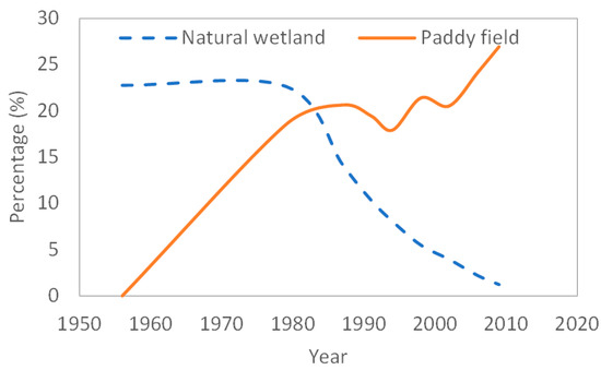 The percentages of natural wetlands and paddy fields in total wetland area in the delta of the Luan River (Data source: [46]).