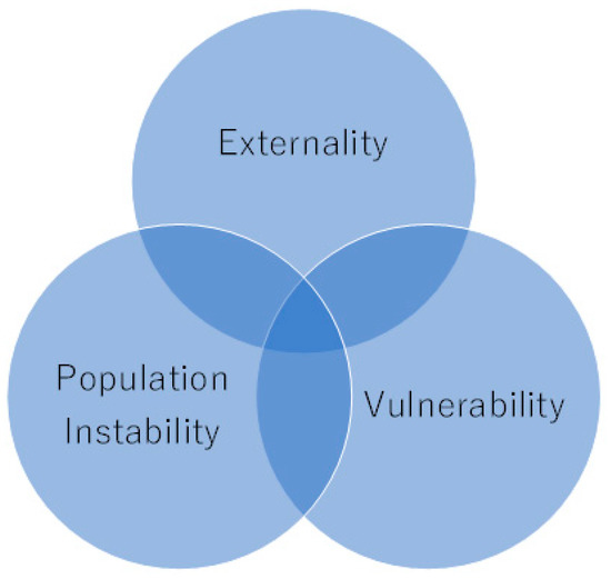 Like the conventional sustainability concept, it has three circles that intersect with each other. The three components are (1) Externality, (2) Vulnerability and (3) Population instability. The overlap area indicates minimal externality, vulnerability, and instability, implying that sustainability is being achieved.