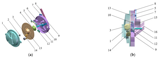 Overall structure of the seed-metering device: (a) expanded view; (b) side view. 1. Front case; 2. fixed nut; 3. initiative pressure relief wheel; 4. matching seat; 5. seed-cleaning wheel; 6. driving gear; 7. adjustable knob; 8. seed adjustable board; 9. rear case; 10. curved blocking board; 11. seeding shaft; 12. seed-unloading tube; 13. seed-metering plate; 14. seed-ejecting wheel; 15. air inlet; 16. seed inlet.