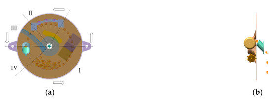 Working zone and seed-unloading process of the seed-metering device: (a) working zone; (b) seed-unloading process. I. Seed filling zone; II. seed-cleaning zone; III. seed-carrying zone; IV. seed-unloading zone.