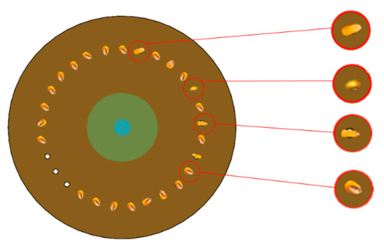 It can be seen that, since the adsorption area is smaller than the total area of the hole, the hole adsorbs one or more seeds. The essence of the multiple seeding problem is that the hole cannot be filled during the seed-adsorbing process, leading to the phenomenon of multiple seeding. The seed-cleaning process can be understood as gradually increasing the adsorption area (Si) of a certain seed. Although the unstable and disadvantaged seeds are cleaned up under the combined action of gravity, centrifugal force, and air current, there is still a stable migration of multiple seeds. Therefore, a reasonable design of the seed-cleaning mechanism can improve the performance of the seed-cleaning, reducing the multiple seeding problem and improving the seeding performance of the seed-metering device in the high-speed range.
