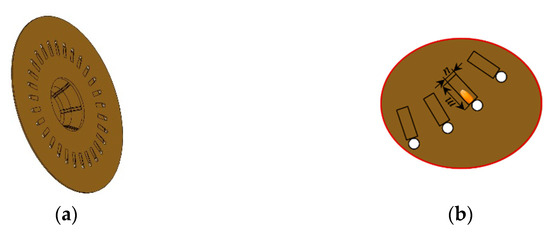 The analysis of Equation (5) shows that the maximal angle of the notch (θ) increases when the rotating speed of the seed-metering plate increases. The larger the angle of the notch (θ) is, the better the effect of horizontal seed-filling and stirring. Therefore, the FS is the main factor that affects the maximal angle of the notch. According to the reference [20] and the common FS and WP range of the pneumatic seed-metering device (8 km/h ≤ V ≤ 14 km/h, 3 kPa ≤ P ≤ 6 kPa), the structural parameters of the designed seed-metering device were designed with an FS of 12 km/h and a WP of 4 kPa. The analysis shows that the rate of horizontal seed-filling increased with the increase of the angle of the horizontal stirring notch, but the greater the notch’s angle, the greater the thickness of the seed-metering plate was. The range of the angle of the notch was calculated according to Equation (5) (0° ≤ θ ≤ 15°). Combined with the reference and the thickness of the seed-metering plate [21], the angle of the horizontal stirring notch was determined as 10°. The range of the length and width of the horizontal stirring notch was calculated according to Equation (1) (12.35 mm ≤ m ≤ 18.53 mm, 9.24 mm ≤ n ≤ 13.86 mm). The length and width of the horizontal stirring notch were determined as 16 mm and 8 mm, respectively.