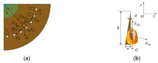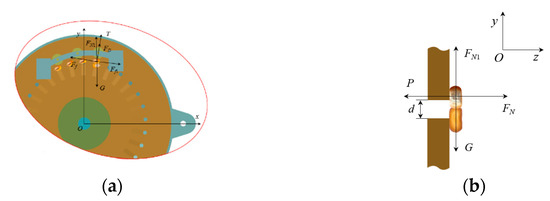 On this basis, if the maize seeds are ensured to carry a uniform circular motion, the force should be balanced along the normal and tangent directions of the motion of the seed, the seeds will not roll and slide, and the force balance equation (Equation (9)) should be satisfied: