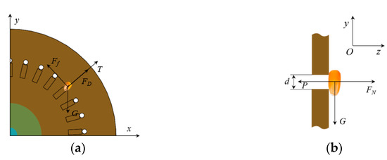 The single seed is absorbed into the hole of the seed-metering plate by the airflow in the seed-filling zone. The rotating center of the seed-metering plate is the origin of coordinate O. The spatial rectangular coordinate system xyz is established, as shown in Figure 6. Force analysis was carried out on the seeds. Under the combined action of gravity (G), the centrifugal force (T), the flow resistance (FD), and the frictional force (Ff), a single seed moves in a uniform circular motion in the seed-metering device. The flow resistance is the resistance of the object when the viscous fluid flows around the object, and its direction is consistent with the direction of the fluid streamline. The equation for calculating flow resistance is as follows: