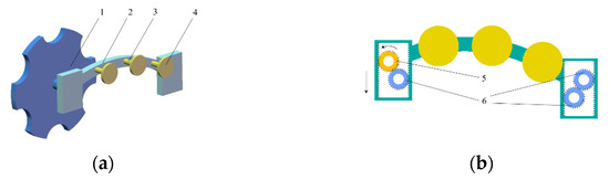 Wheel-seed-cleaning mechanism: (a) structural diagram; (b) simplified diagram. 1. Adjustable knob; 2. double-row teeth supporting plate; 3. wheel seed-cleaning bracket; 4. rubber seed-cleaning wheel; 5. driving gears; 6. driven gears.