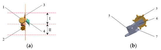 After the process of seed-unloading, a seed-ejecting wheel device is arranged in front of the seed-filling zone to avoid impurities or to prevent fine particles from blocking the mold hole, causing continuous missing broadcast problems, as shown in Figure 10b. It is mainly composed of a seed-ejecting wheel, a seed-ejecting wheel connecting part, a mounting seat, and a telescopic spring. Under the action of spring force, the teeth of the seed-ejecting wheel mesh with the hole of the seed-metering plate when the seed-ejecting wheel is in operation. It ensures that the hole is not filled into the seed-filling zone. The specific design refers to [32] to optimize the configuration.