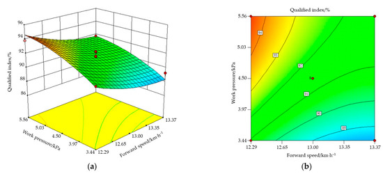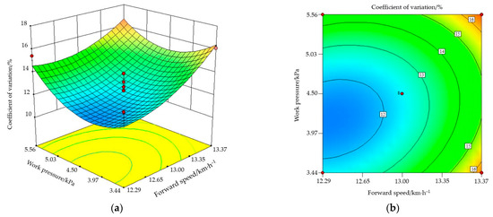 The response surface was obtained using Design-Expert 10.0.7 to visually analyze the relationship between performance indexes and experimental factors under predetermined working performance indexes to meet the requirements of precision seeding. The influence rule of each factor was analyzed. According to the correlation regression equations and the contour distribution density of the response surface graph, the interaction between the FS and the WP of the seed-metering device had significant effects on the QI and the CV. As indicated by Figure 12, when the FS was unchanged, the QI increased first with the increase of the WP. When the WP was unchanged, the QI decreased with the increase of the FS. When the FS changed, the range of the QI changed greatly, so the FS was the main factor affecting the QI. As indicated by Figure 13, when the current FS was unchanged, the CV decreased first and then increased with the increase of the WP. When the WP was unchanged, the CV increased with the increase of the FS. When the FS changed, the variation range of the CV was large, so the FS was the main factor affecting the CV.