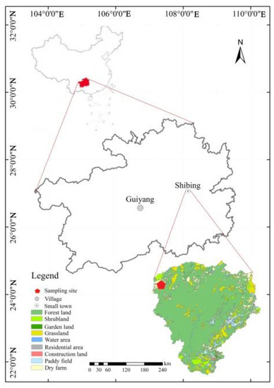 This study area was located in Shiqiao Village, Shibing County, Guizhou province, China (Figure 1). It is a typical dolomite karst mountain-canyon landform type, with large undulations in the area and an altitude of 530–1100 m. The demonstration area is dominated by a subtropical humid monsoon climate, and the vegetation types are mainly subtropical evergreen broad-leaved forests. The average annual temperature is 16.5 °C, the average annual precipitation is 1348.1 mm, the average annual sunshine duration is 1138.6 h, the annual average relative humidity is 79%, the forest coverage rate is 93.95%, the lithology is a thin layer of fine-grained dolomite of the Cambrian Gaotai Formation, the soil is mainly black lime soil, and some of the soil is rich in gravel [17,19]. The main crops are Oryza sativa, Zea mays, Nicotiana tabacum, Brassica napus, Capsicum annuum, Pseudostellaria heterophylla, S. miltiorrhiza, and other crops. There is a long history of agricultural cultivation in this area.