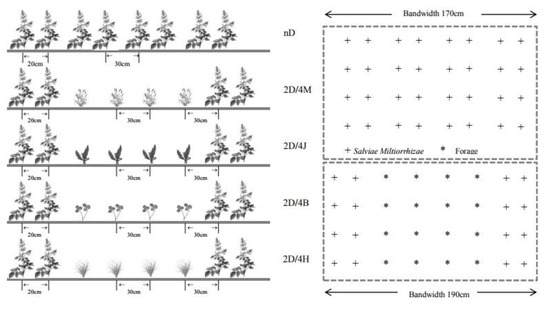 Schematic diagram of the planting mode. Note: nD indicates the number of rows of the single crop of S. miltiorrhiza. 2D/4M, 2D/4J, 2D/4B, and 2D/4H indicate two rows of S. miltiorrhiza intercropped with four rows of D. glomerata, C. intybus, T. repens, or L. perenne, respectively.