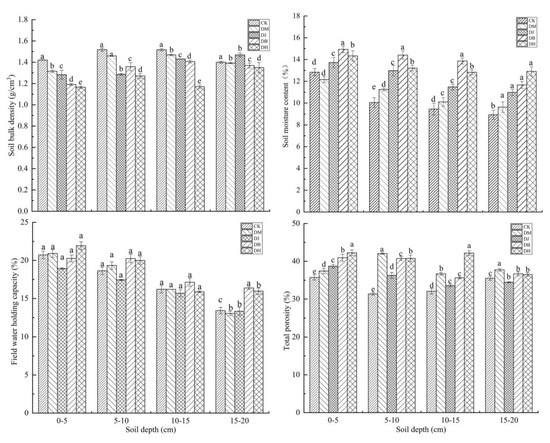 The soil bulk density in this experiment was between 1.1 and 1.5 g/cm3. In the soil layers of 0–5 and 10–15 cm, the soil bulk densities of the four intercropping methods were lower than that of the CK, and the difference was significant (Figure 3). In the 5–10 cm soil layer, the CK had the highest soil bulk density, which was not significantly different from the DM treatment. In the 15–20 cm soil layer, the bulk density of the soil treated with DJ was the highest, and the difference between CK and DJ was not significant. The soil water content of intercropped soil was higher than that of the monoculture (excluding the DM treatment), and it decreased with the increase in soil depth. The soil moisture content of the DM treatment in the 0–5 cm soil layer was lower than that of the monoculture, and the difference was not significant, while the soil moisture content of the four intercropping modes in the soil layer of 5–20 cm was higher than that of the monoculture, with a significant difference. The soil water-holding capacity in the field gradually decreased from the surface layer to the lower layers. Within the soil layer of 0–15 cm, the changing trends of the four intercropping patterns were inconsistent. Compared with the single cropping, the difference was not significant, but there was a significant difference in the bottom layer. The total porosity of the soil in the 0–5 cm soil layer was the highest in the DH treatment, and the difference was significant (p < 0.05). The total porosity in the 5–10 cm soil layer was highest in the D. glomerata treatment, and the difference between intercropping and single cropping was significant (p < 0.05). In the 10–15 cm soil layer, the total porosity of the DH treatment was significantly higher than that of the other treatments, and the difference between the DJ and DB treatments was not significant (p > 0.05). In the 15–20 cm soil layer, the total porosity of the DM treatment was the highest, and the DJ treatment was the lowest. There was no significant difference between the DB and CK treatments (p > 0.05).