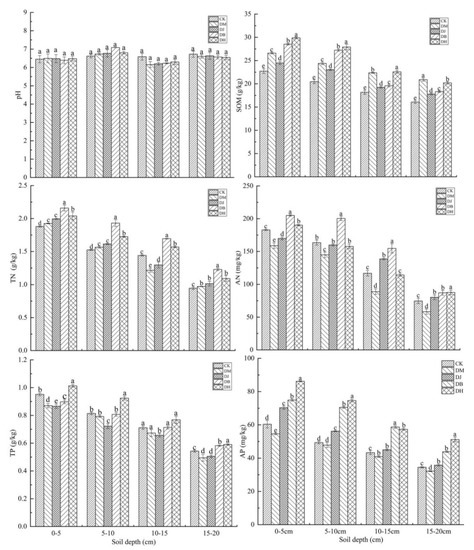 The intercropping patterns had different effects on the soil chemical properties in different soil layers, and the differences between the intercropping modes and monoculture were significant (Figure 4). In the 0–5 cm soil layer, intercropping had significant effects on SOM, AN, TP, and AP content. Compared with single cropping, the TN content of the soil treated with DH increased by 7.79%. The contents of AN and TP of the DM and DJ treatments were reduced by 15.12%, 9.35%, 7.69%, and 9.91%. The TN content of the DM treatment was not significantly different (p > 0.05). In the 5–10 cm soil layer, the content of SOM was significantly different in the intercropping pattern (p < 0.05). The TN content of the DM treatment was not significantly different from that of the CK. The contents of SOM, TN, AN, and AP in the DB treatment increased by 16.54%, 2.61%, 8.74%, and 14.29%. Compared with CK, the contents of SOM, TP, and AP in the DH treatment increased by 26.68%, 11.9%, and 33.83%. In addition, the TP and AP contents of the DM treatment were reduced by 2.77% and 3.26%, and there was a significant difference (p > 0.05). In the 10–15 cm soil layer, the SOM and TN contents were significantly different among the treatments (p < 0.05), the content of AN was significantly different, except for the DH treatment (p < 0.05), and the TP content of the soil showed no significant difference between the DM and DB treatments (p > 0.05). There was no significant difference in the AP content between the DH and DJ treatments (p > 0.05). In the 15–20 cm soil layer, the content of SOM was significantly different in all treatments, the TN content of DM and DJ was not significantly different from that of CK (p > 0.05), the AN content of DJ was not significantly different from that of CK (p > 0.05), the TP content of DJ and DM was not significantly different from that of CK (p > 0.05), and the AP content of DJ was not significantly different from that of CK (p > 0.05).