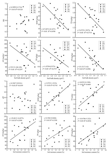 Linear diagram of the correlation of bulk density and water content with chemical properties. DM = S. miltiorrhiza + D. glomerata intercropping; DJ = S. miltiorrhiza + C. intybus intercropping; DB = S. miltiorrhiza + T. repens intercropping; DH = S. miltiorrhiza + L. perenne intercropping. Different lowercase letters indicate significant differences (p < 0.05). pH = soil pH; SOM = soil organic matter; TN = total N; TP = total P; AN = alkaline hydrolysis N; AP = available P.