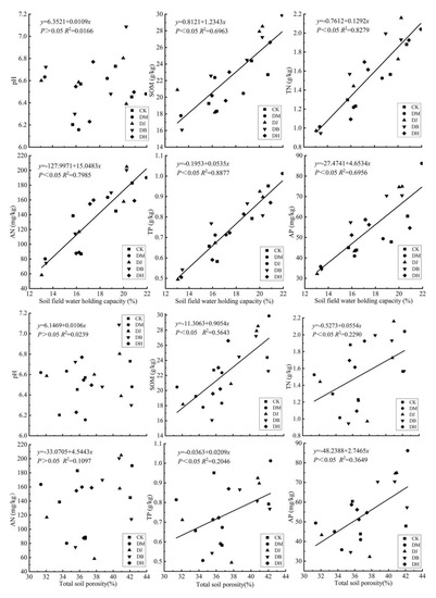 A linear regression equation was used to analyze the correlations of the soil physical and chemical properties under different intercropping modes (Figure 5 and Figure 6). The results showed that the soil pH and physical indicators had an insignificant linear relationship (p > 0.05). The nitrogen, phosphorus, and organic matter content and field water-holding capacity in the soil had a strong positive correlation; they had a significant negative correlation with soil bulk density, but they had a significant positive correlation with soil moisture content. There was an insignificant linear relationship between the soil available nitrogen and total soil porosity, while organic matter had a strong positive correlation with the total soil porosity.