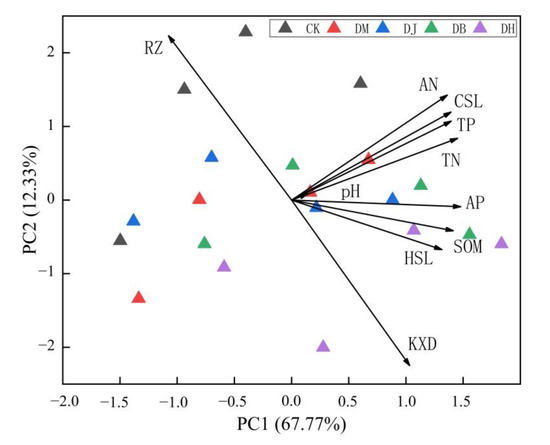 In order to further explore the impact of intercropping on the soil environment, principal component analysis was performed on the data from each sampling point. It was preliminarily found that the correlation coefficients between the various indicators were mostly greater than 0.3 (Table 2), indicating that there was a high degree of information repeatability between the factors, which met the requirements of principal component analysis. A further dimensionality reduction and two common factors were proposed, and the cumulative contribution rate of the common factors reached 80.10%, which indicated that the physical and chemical characteristics of the soil was reflected (Figure 7). As shown in Figure 7, the contribution rate of the first factor was 67.77%, and the order of correlation was: AP > TN > SOM > TP > CSL > AN > HSL > RZ > KXD > PH. This shows that the relationship between the pH and the physical and chemical properties of the soil was weak, and the correlation between the soil moisture and N and P was strong, indicating that water is more important for nutrient transport. The score of the first principal component in the DH treatment was much higher than those of other treatments. It was because that the root system of DH treatment was developed and dense, the interception effect was better, the water retention capacity was high, and the nutrient transfer was guaranteed.