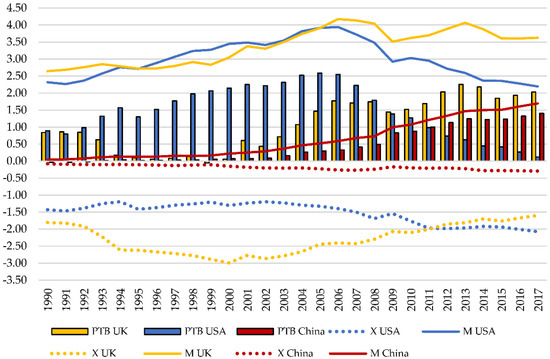 - Physical Trade Balance (PTB): it is the difference between material imports and exports [18,19,23,34,42,43]. It is constructed inversely to the monetary trade balance because physical flows move in the opposite direction to monetary flows, so its interpretation is also inverse to the usual one [23,42,44].