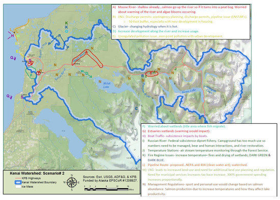 Chicago/Turabian StyleTrammell, Jamie, Meagan Krupa, Paula Williams, and Andrew Kliskey. 2021. "Using Comprehensive Scenarios to Identify Social–Ecological Threats to Salmon in the Kenai River Watershed, Alaska" Sustainability 13, no. 10: 5490. https://doi.org/10.3390/su13105490