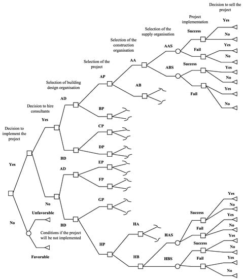 Here, we briefly present the modelling of stochastic process that was introduced in the previous researches. The objective function is to maximize value (profit), which should be received by the investor (the model was developed for a private investor). The decisions were expressed in integer form by or 1, i = 1, 2, 3, ..., g (describes the decision tree level); j = 1, 2, 3, ..., m (describes the branch group in the decision tree level); k = 1, 2, 3, ..., n (describes the branch in the group); ; ; if —alternative ijk is selected; if —alternative ijk is not selected; —describes probability of events, ; . We also measure the profit/losses , which can be chosen as a better alternative: