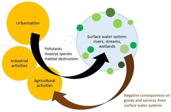 Disturbance sources (pollutants), in situ surface water conditions, and effects on services and consumers (adapted from [8]).