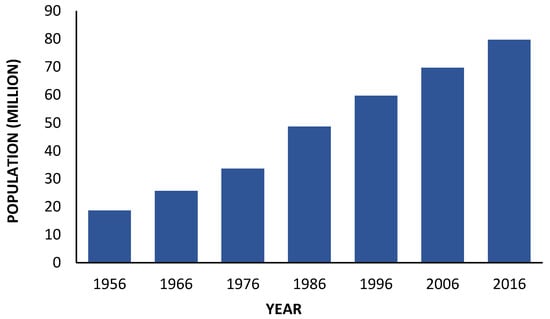 The Anzali watershed (situated in Guilan Province) includes important environmental systems such as the Anzali wetland and the Hyrcanian forests. Over the last few years, there has been a rapid degradation in the watershed of the Anzali wetland [17]. Based on Table 1, population growth and intensive agriculture, urbanization, and industrialization are the main driving forces that are responsible for the degradation of the Anzali wetland and its watershed. Iran’s population increased dramatically during recent decades (Figure 3), reaching about 80 million by 2016 [18]. In 2016, the average annual population growth of Iran was 1.2% higher compared in 2011 and the largest age group was 30–34 (10.8% of the population) [19]. The population growth was also significant in Guilan Province from 1990–2013. For example, in the three main cities located within the Anzali wetland watershed, e.g., Somesara, Rasht, and Fuman, population growth increased by 38%, 25%, and 11%, respectively [20].