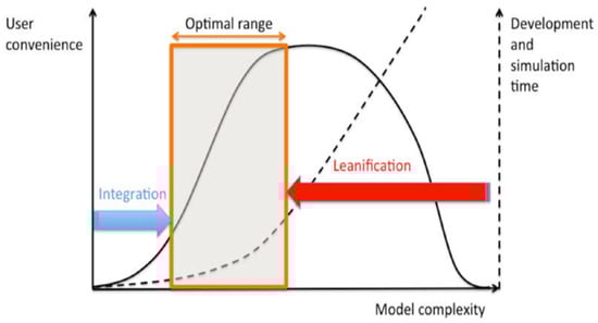 A main aspect of applied ecological modeling is to determine an appropriate equilibrium (Figure 6) between the number of processes and the user convenience (development time and reliability) of the models [15]. Several biotic and abiotic characteristics of the aquatic ecosystems can be integrated to determine the wetland conditions with human activities [14]. However, wetland systems are complex in themselves and are characterized by many internal system interactions, which can be drastically altered via diverse human activities. Therefore, an efficient and applied modeling approach should determine an appropriate equilibrium between the combination of more processes and environmental parameters, in balance with development and simulation times (and costs) that wetland managers and stakeholders can offer. In some cases, relatively simple models might be more practical to investigate particular aspects in a short time span, while in other cases, a higher level of model complexity and reliability is more important than a shortened simulation time [15]. The latter can be the case when large interventions are needed, which entail huge investments (e.g., dredging for channel deepening and maintenance, land use reshuffling).