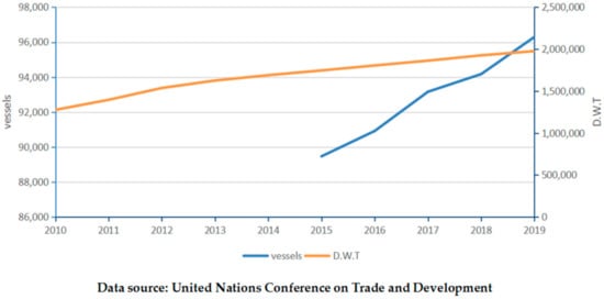 Maritime shipping plays a critical role in international merchandise trade in light of the fact that approximately 90% of cargo is transported by ships [1]. Furthermore, according to the prediction made by UNCTAD (United Nations Conference on Trade and Development), international maritime trade will expand at an average annual growth rate of 3.5% over the period of 2019-2024 [2], although this figure could be lower due to the unexpected appearance of COVID-19; nevertheless, the tendency toward increasing international maritime trade will continue. In fact, over the past decade, the total number of vessels and deadweight tonnage (DWT) globally has continued to expand, as illustrated in Figure 1, in which the data comes from the review of maritime transport for 2010–2019 issued by UNCTAD. It is widely accepted that safety issues are combined with maritime trade and that maritime safety issues will become more pressing with increasing numbers of vessels. Therefore, the safety level of navigating ships and the prevention of pollution from ships have become common concerns at national and international levels. For this reason, the International Maritime Organization (IMO) continuously issues conventions, codes, and guidelines to ensure the safety level of maritime shipping operations. For example, as early as the 1970s, the IMO issued the well-known International Convention on Standards of Training, Certification and Watchkeeping for Seafarers (STCW) to supervise the unsafe acts of seafarers; in addition, the International Convention for Safety of Life at Sea (SOLAS) was established to provide detailed guidelines for seafarers working on board ships. Apart from the IMO, there are many other international organizations, such as the International Labour Organization (ILO), International Association of Marine Aids to Navigation and Lighthouse Authorities (IALA), and International Association of Ship Classification Societies (IACS), which pay attention to the safety of maritime shipping operations. According to the statistics collected by [3], maritime accidents presented a downward tendency from 2000 to 2012, but the situation is far from satisfactory, according to the “safety and shipping review 2019” issued by [2], and there were still 2698 shipping accidents in 2018. The safety of maritime shipping is still a thorny issue that it is urgent to solve.