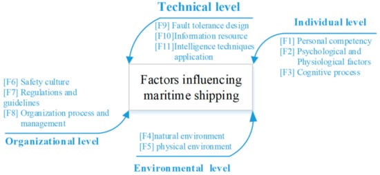 The safe operations involved in maritime shipping can be regarded as a complex socio-technical system that is a determinant for the sustainable development of the maritime shipping industry. There are various impacting factors that influence “things go right” and “things go wrong”, which are presented as factors that influence safety in different types of documents, and these factors can be classified based on many different principles. According to typical safety-related studies [44,45], the factors that contribute to safety can be categorized as individual cognition, organizational capacity, and environmental situations. However, the behaviors of individual people and organizations are undergoing notable changes with the introduction of modern technologies, such as artificial intelligence, automation, neural networks, and big data analysis, which are currently applied to solve safety issues associated with maritime shipping [22,46]. Therefore, in the present study, we added the technique factors to the traditional factors system, which is illustrated in Figure 2.
