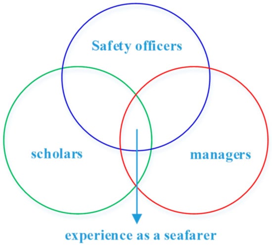 According to the aforementioned selection principle, five experts are employed to be consultants. As shown in Figure 4, all of the five experts are shared with a common experience in the shipping industry; e.g., they have been working as a seafarer on board the ship. The expert group is heterogeneous except for this common experience: two experts are senior scholars coming from academic institutes, two experts are working as marine safety supervisors in MSA, and one expert is the safety manager of a maritime company. Although the careers of the employed experts are diverse, they are familiar with almost every aspect of maritime safety-related issues. The general information of the five experts is summarized in detail in Table 3.