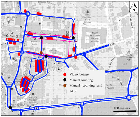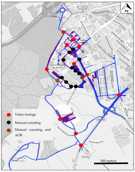 Figure 2 displays the 24 key locations defined to collect traffic volumes (pedestrians, cyclists, and motor vehicles) and vehicle AOR during the morning peak hour between 8:45 and 9:45 a.m. (most traffic congested period). These monitoring zones resulted in a total of 103 monitoring points. Traffic volumes were recorded through manual counting (5-min interval) or video recording, while AOR was assessed via manual counting in two of the main entrances to the campus. A total of over 50 h of video recordings were thoroughly analyzed.