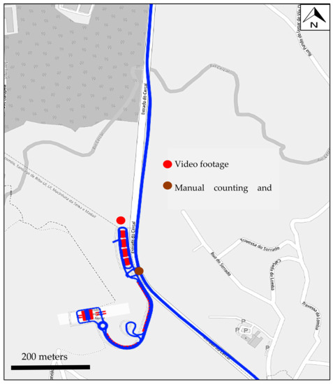Figure 4 presents the 2 monitoring zones defined to collect traffic volumes (pedestrians, cyclists and motor vehicles) and vehicle AOR during the afternoon peak hour between 5:45 and 6:45 p.m. (most traffic congested period). These monitoring zones resulted in a total of 10 monitoring points. Traffic volumes (pedestrians, cyclists and motor vehicles) were recorded through video recordings, while AOR was assessed via manual counting at the entrance of the campus. In this campus, approximately 10 h of video recordings were gathered.