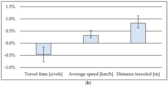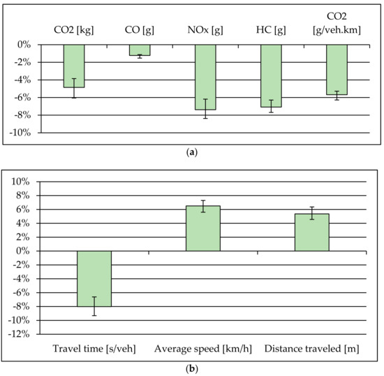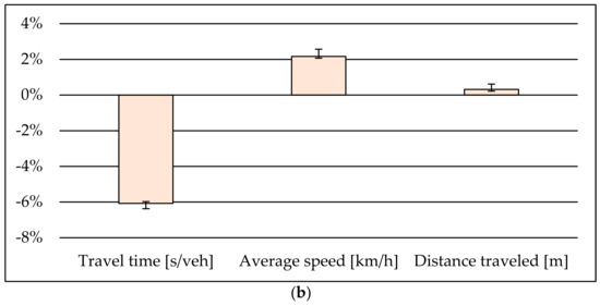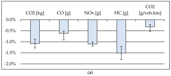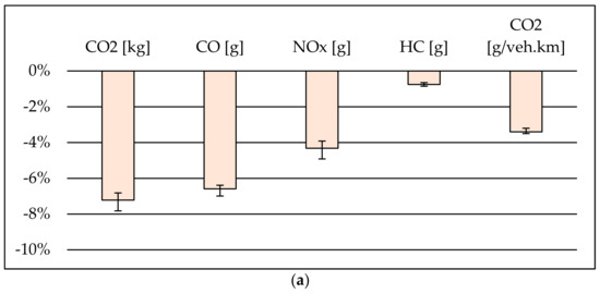 Figure 8a,b presents the percentual variation concerning vehicular pollutants emissions between the carpooling and the baseline scenarios and the percentual variation regarding road traffic performance parameters, comparing the implementation of carpooling with the baseline scenario in ESTGA, respectively.
