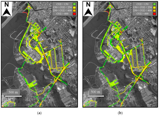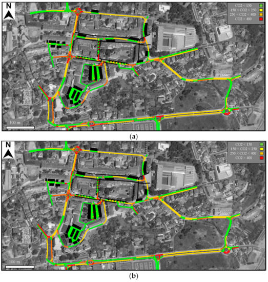 Figure 9a,b exhibits the CO2 emissions hotspots of both the baseline and carpooling scenarios in ESTGA. Although impacts were not statistically significant during the simulation period, the carpooling scenario improved the network environmental impacts, more specifically, there were clear improvements at intersections.