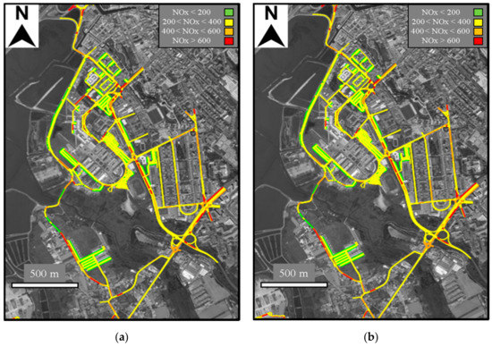NOx emissions hotspots maps in milligrams per kilometer, per vehicle: (a) ESTGA baseline; and (b) ESTGA carpooling. Background map source [Bing Maps].