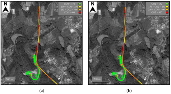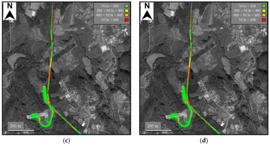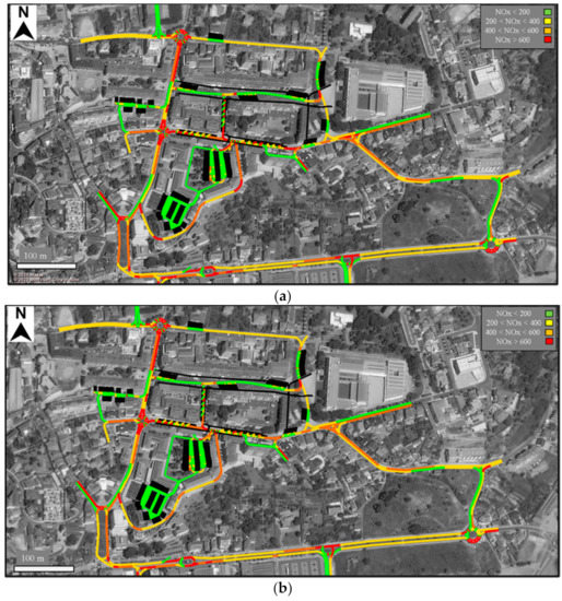 Figure 10a,b depicts the NOx emissions hotspots of both the baseline and carpooling scenarios in ESTGA. CO2 carpooling also achieved lower average NOX emissions per kilometer and, although not significant, the hotspot map is characterized by fewer red road segments.