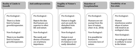 “The new ecological paradigm revisited: anchoring the NEP scale in environmental ethics” by Lundmark [10] uses environmental ethics to investigate the underpinning theory of the NEP scale. Specifically, it attempts to determine which ethical orientations are aligned with the scale’s components. Anthropocentrism and ecocentrism were appropriately used to structure the analysis, as these two theories capture most of the discussions surrounding the relationships between human beings and nature.
