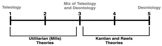 In past studies, deontological and teleological philosophical theories have been presented as the most significant influences on ethical decision making [27,28]. Deontological ethical theories involve rule-based thinking and are grounded firmly in the idea of duty. When making ethical decisions one should stick to the pre-determined rule regardless of the consequences. These theories state that ethical dilemmas should be resolved by applying the universal standard or code of justice that everyone must follow.