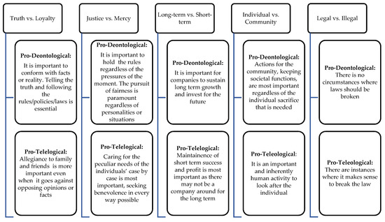 The aforementioned twelve statements were broken into five categories, four of which reflect R. M. Kidders’ framework of ‘right versus right’ paradigms of ethical dilemmas from his book “How Good People Make Tough Choices” [57]. The statements that fall into these four categories include situations where one must agree or disagree to an action, where agreeing or disagreeing to the statement could both be right and therefore the situation poses an ethical dilemma. The five categories are as following: (1) Telling the truth vs. remaining loyal to family, friend or colleague. There are certain situations where being loyal to a friend or telling the truth both have equally as many consequences as they have rewards. (2) Executing justice or providing mercy. Both justice and mercy are evident in the law and in religiosity and create powerful opposing dilemmas. (3) Provide short term versus longer term benefits. Many current business dilemmas revolve around short term vs. long term dilemmas. (4) Provide greater benefit for the Individual versus the community. It is an important and inherently human activity to look after the individual while at the same time not meeting the needs of the community can affect everybody. The fifth category of statements is classified as legal versus illegal action choices. Kidder argues that this is not a ‘right versus right’ dilemma because there is a clear line between what is right and what is wrong, and these situations are only caused by a lapse in moral judgement or a moment of moral temptation. However, it should be noted that an illegal activity is not always immoral, and a legal activity is not always moral [58]. Within each of the five categories, the selected action choices are either aligned with a more deontological/idealistic or more teleological/relativistic ethical orientations (see Figure 2).