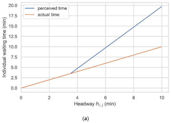Research by Fan et al. [24] shows that stops and stations with high amenities reduce the perceived waiting time to some extent. Thus, we can use parameters , instead of , to represent the differences of amenities, the waiting expectation of various kinds of people, and other factors in the real world. Figure 1a shows the linear relationship between the perceived waiting time and actual waiting time for an individual passenger. Figure 1b shows the relationship between the total waiting time and the headway .